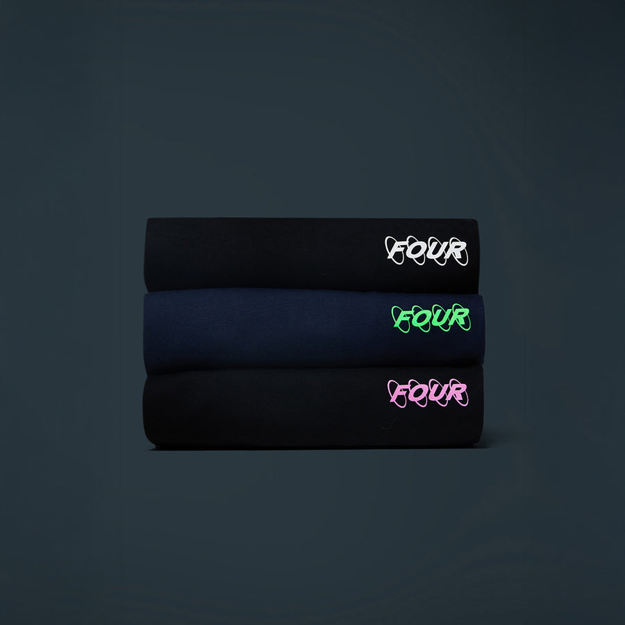 The design features slanted zip pockets with reversed zippers, an adjustable drawcord waistband, and elasticated cuffs for a secure fit. A reflective back pocket adds utility and visibility, while the neon yellow HD logo delivers a bold FOUR signature finish. Perfect for both active days and laid-back moments.